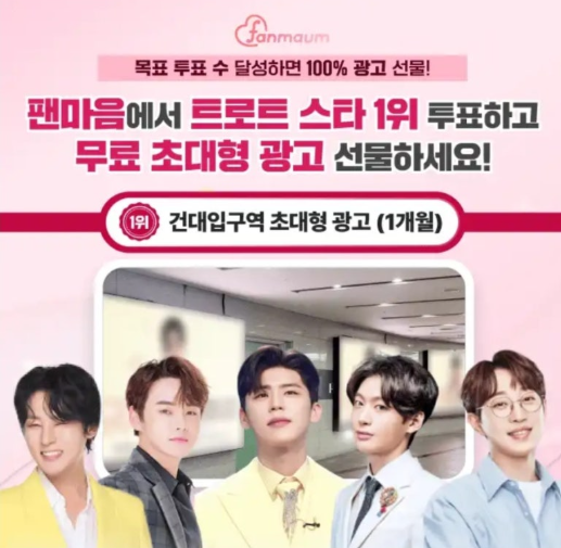 팬마음 트로트 스타 41차 투표 1위 스타에게는 하루 유동 인구 30만 명인 건대입구역에 3중 OOO광고를 1개월 동안 해드려요!