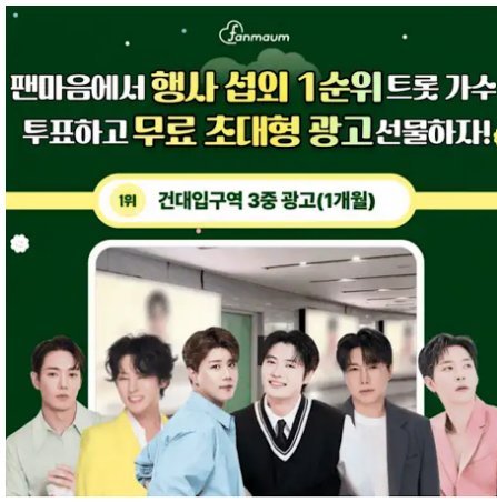 팬마음 행사 섭외 1순위 트롯 가수 투표에서는 1위를 달성한 스타에게 유동 인구가 많은 OOOOO에 3중 초대형 광고를 선물해 드려요.