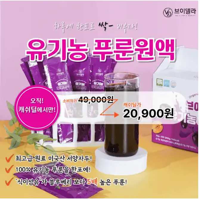 단 1시간 동안 초특가로 진행되는 브이델라 유기농 푸룬즙은(30gX30포) 고급 원료인 서양자두로 물한방울 없이 그대로 착즙한 푸룬즙 입니다. "건강의 첫걸음 장건강" 푸룬의 식이섬유는 바나나의 3배, 블루베리보다 "O"배 높습니다. 몇 배 더 높을까요?
