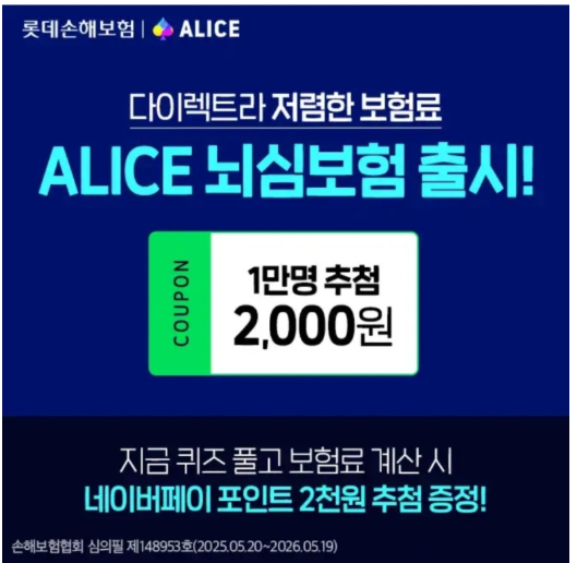 롯데손해보험 ALICE에서 출시한 ALICE ○○○○, 다이렉트라 저렴한 보험료를 지금 확인해보세요. (초성 힌트 : ㄴㅅㅂㅎ)