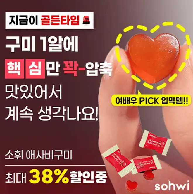 가짜 배고픔에 매일 속는다고요? 문제는 스파이크에요. 군것질 대신 새콤한 <소휘 애사비 구미>가 가짜 식욕 싹-잡아줄꺼에요!