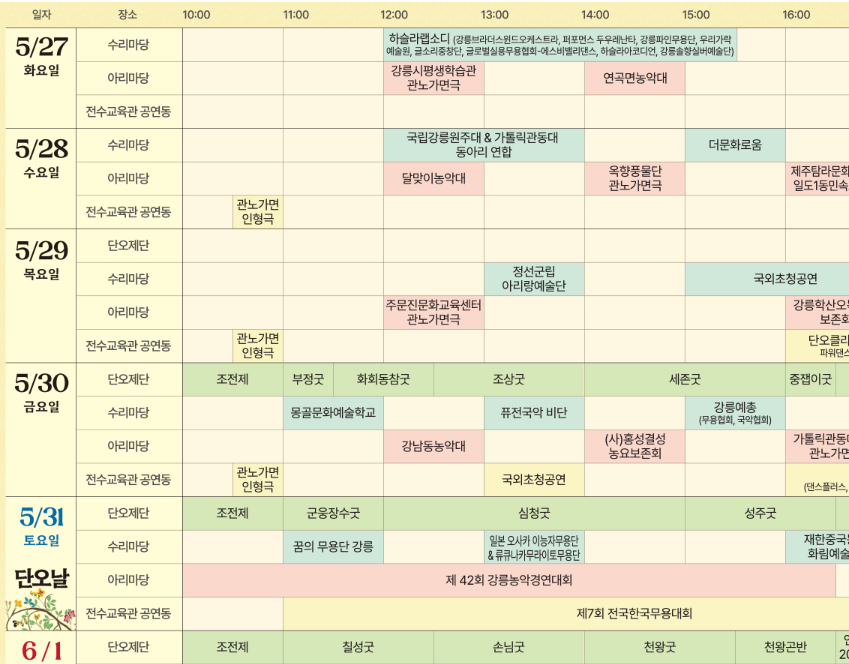 아래에서 프로그램 및 불꽃 놀이 일정 확인하셔서 단오제를 즐기시기 바랍니다.