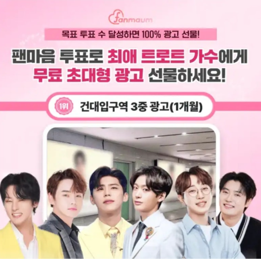 팬마음 트로트 스타 43차 투표 1위 스타에게는 하루 유동 인구 30만 명인 건대입구역에 OOOOO 광고를 1개월 동안 해드려요!