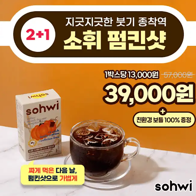 "카페인도 혈당 올려요" 커피대신 무카페인 호박차 1포로 숨어있는 나트륨 쭉쭉 빼드릴게요 🚨지금 여기서만 2+1혜택 칼륨이 풍부해 과하게 섭취한 나트륨, 수분은 빼고 풍부한 식이섬유는 보충해 V라인 관리에 최고인 소휘 펌킨샷! OO에서는 이미 아이들도 커피대신 마시는 유기농 오르조 보리를 함께 담았어요. 매일 마시던 물만 바꿔보세요. 여기서 OO은?