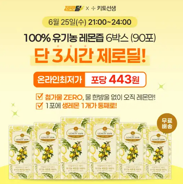단 3시간! 100% 유기농 레몬즙, 제로딜 단독구성 & 온라인최저가 리얼마이즈 NFC 착즙 레몬즙 인기옵션 특별구성! 6박스 구매시 1포 443원, 12박스 구매시 【1포당 단 361원!】 리얼마이즈 레몬즙 1포에는 약 OOg의 레몬 1개가 담겨있어, 풍부한 비타민 C와 자연 그대로의 맛을 매일 간편하게 즐길 수 있답니다~ OO은 무엇일까요?