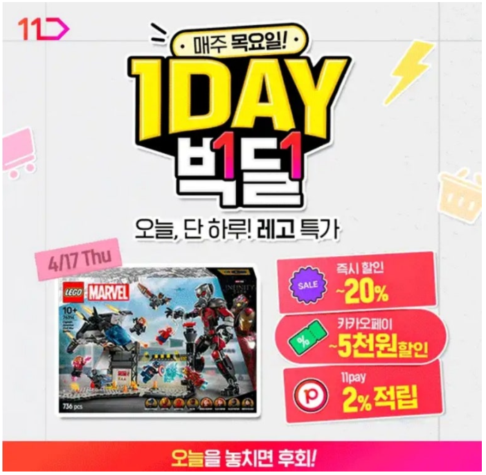매주 목요일에 만나는 핫-딜! 오늘 단 하루 00000 [레고] 브랜드 역대급 할인 중! 오늘은 최대 20% 즉시 할인 쿠폰에 카카오페이 머니 이용하면 최대 7% 추가 할인까지 드려요~ 다시는 없을 역대급 혜택! 00000에 들어갈 단어는 무엇일까요? (초성힌트: ㅇㄷㅇㅂㄷ)