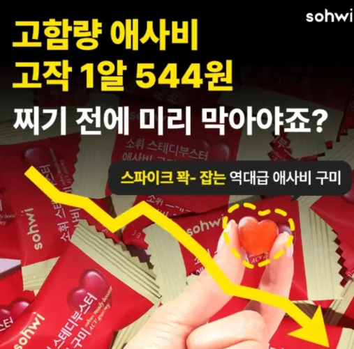역대급 애사비 한 샷 1구미에 꽉- 스파이크 꽉 잡는 입막템 구미🍎 고민하면 품절돼요 이 구미 한 알이 지금 먹고 계신 그 시큼쿰쿰 맛없는 애사비보다 함량 더 높아요. 그냥 젤리보다 맛있는 <소휘 애사비 구미> 역대급 함량! 살찌는 설탕폭탄 군것질 대신 당류1g 애사비 구미로 식욕 못참는 가장 큰 원인 OOOO📉 확실하게 도와드려요. 여기서 OOOO은?