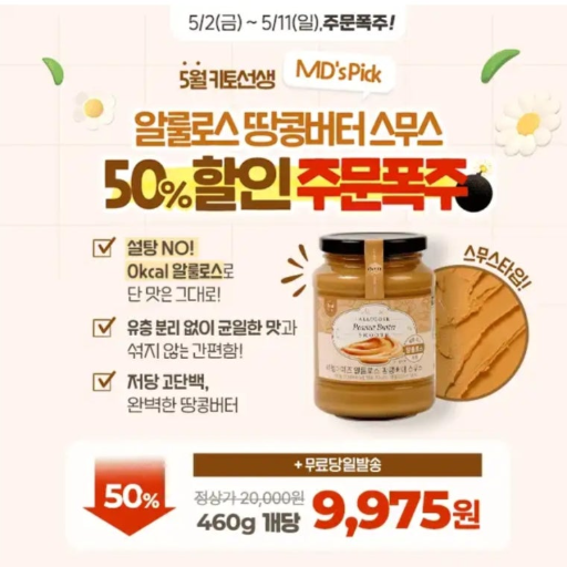 <주문폭주> MD's Pick! 알룰로스 땅콩버터 스무스 50% 할인 수량이 얼마 남지 않았어요! 개당 9,975원 & 무료당일배송으로 빠르게 만나보세요! 리얼마이즈 땅콩버터는 아이부터 어른까지 누구나 섭취 가능하답니다~ 설탕 대신 알룰로스로 건강하게 단 맛을 살려, O OO이 맛있고 건강하게 즐길 수 있어요. OOO은 무엇일까요?