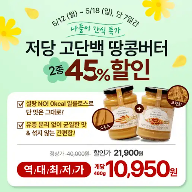 [단 7일 스토어 단독] 나들이 간식 특가 저당 고단백 땅콩버터 2종 45% 할인! 지금 구매 시, 역대최저가 + 무료배송 + 내일도착 혜택 적용 리얼마이즈 땅콩버터는 설탕 대신 알룰로스로 단 맛은 그대로, 맛과 건강 모두 챙겼어요. O OO OO 맛있는 땅콩버터를 찾는 분께 추천 드려요! OOOOO은 무엇일까요?